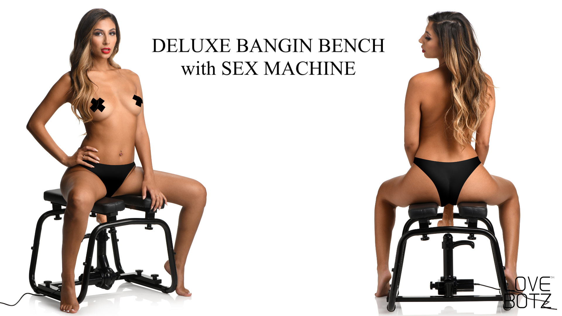 Intensify your solo sessions and spice up your couple's play with this Deluxe Bangin' bench with included sex machine! The comfortable bench has two, wide, elastic straps that create a supportive seat that you can bounce on when using with your partner or a personal toy. The wide straps can be switched with the firm, plush, PU leather cushions for when using with the sex machine. The steel frame is durable and can handle up to 220 lbs of weight; don't be shy about giving it your roughest thrusts and rides! A sex machine that is perfectly compatible with the Bangin' Bench can be attached the the bars and mounted in place so the power-packed thrusting can reach your wet and yearning holes! Adjust the angle of the dildo so you can enjoy multiple different positions that hit your sweet spot while you are seated above, angled forward, leaned back, facing front or reversing your position! The Bangin' Bench helps you get your juices flowing with the machine or with a partner positioned below you! The dildo is made out of TPE (thermoplastic elastomer) rubber and is realistic with veins and a firm but flexible core. The dildo and machine can be used separately from the bench while you're positioned on a chair, table, couch or on all fours! Control the thrusting using the variable speed dial on the corded remote. The thrusting sex machine is powered by plugging it into a wall outlet. Enjoy up to 195 thrusts per minute and get blown away by the power!